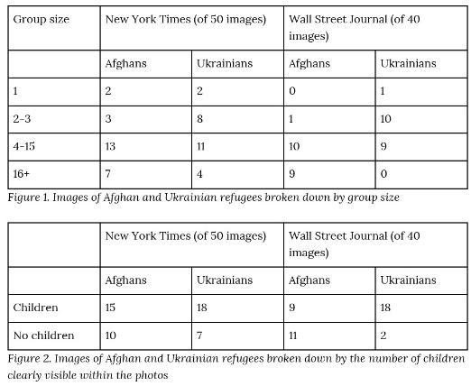I was able to gather 40 images from the Wall Street Journal (20 of Afghans, 20 of Ukrainians) and 50 from the New York Times (25 of Afghans, 25 of Ukrainians) which had more extensive coverage of refugees. I looked at the size of groups represented in photos, and whether children could be clearly identified in these photos. This was to test both Bleiker and Christie’s statements on what kind of images created an emotional response.