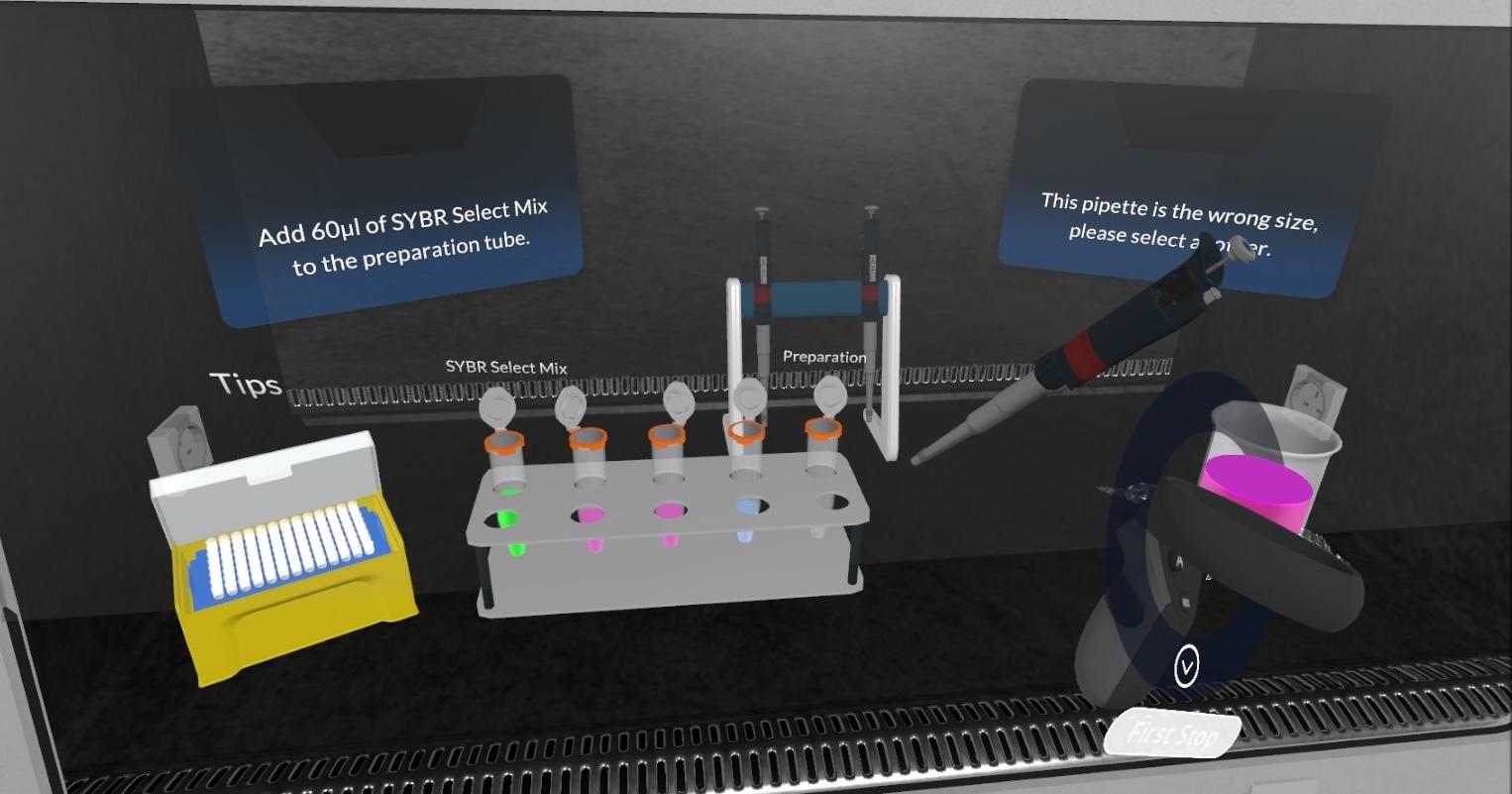 A key laboratory for undergraduates in Life Sciences at the UofG is the Junior Honors Molecular Methods (MM) course, that allows students to gain practical skills in molecular biology that are essential for future employability. As part of the online delivery of the MM course during the COVID-19 pandemic, a new bespoke Virtual Reality (VR) app was utilised. The VR app was embedded into a ‘Disease Diagnostics’ lesson within the MM course, with the user experiencing the processes involved in diagnosing a viral disease in an immersive research lab environment. This VR app was designed by a team of UofG staff and the VR-design company, Edify in 2017, utilised during the COVID-19 pandemic remotely by-proxy, and since 2022 been delivered on campus.