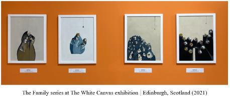 Their creative process is deeply intertwined — often drawing inspiration from one another’s work. Many of Shatha’s painting series address specific social themes, while Saber collaborates either musically or through shared conceptual development. Likewise, Shatha’s visual narratives frequently respond to Saber’s musical compositions. This dynamic exchange has resulted in a body of work that is emotionally layered and multidimensional. Key joint projects include The Family Series (Through The White Canvas exhibition), Scratched Identities, IDPs (Internally Displaced Persons), and Monument of Childhood, among others.
